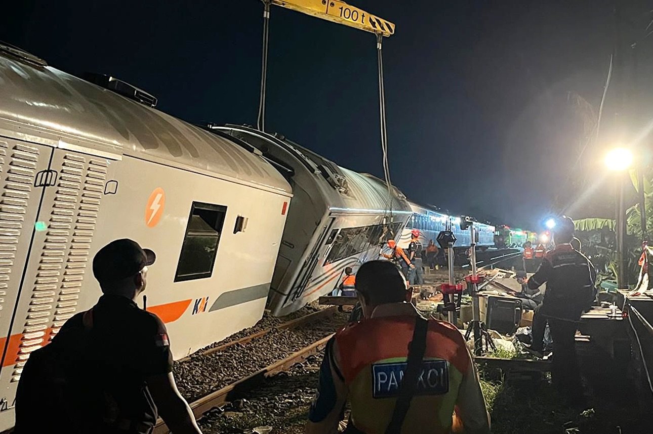 Mereka kemudian melakukan pengaturan arus lalu lintas di sekitar lintasan yang terdampak akibat dua gerbong bagian belakang kereta yang anjlok.