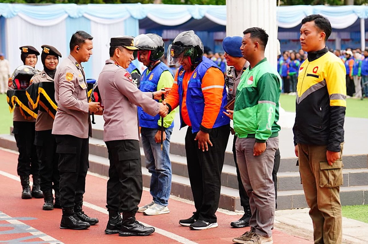 SwaraMediaKaltim.com – Kapolri Jenderal Listyo Sigit Prabowo memimpin apel ojek online (ojol) kamtibmas “Sauyunan Jaga Lembur” Polda Jawa Barat di Lapangan Upakarti, Soreang, Kabupaten Bandung, Jawa Barat (Jabar), Sabtu 8 November 2025.