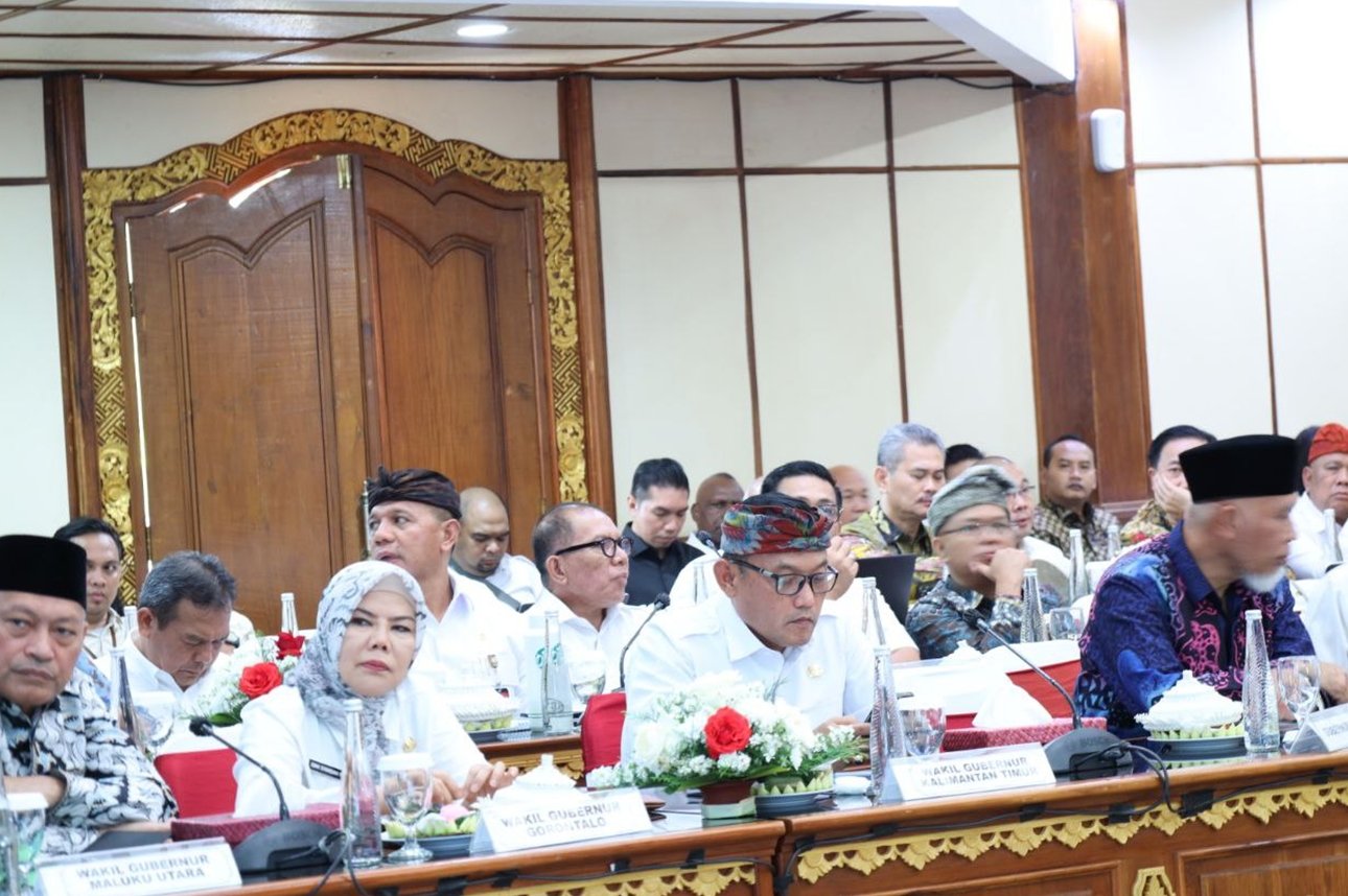 Tampak hadir Gubernur Bali I Wayan Koster, Menko Bidang Pangan Zulkifli Hasan, Menkop Budi Arie Setiadi, Mendes PDT Yandri Susanto, Mendag Budi Santoso, Menkum Supratman Andi Agtas, Menpan RB Rini Widyantini, para wakil menteri/lembaga, kepala daerah (gubernur/wakil gubernur), pimpinan BUMD serta para pejabat perwakilan provinsi se-Indonesia. (aya)